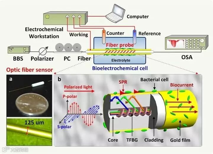 然而,光纤由石英制成(主要成分SiO2),不导电,无法实现生物微电流或微电势检测。为了解决这一瓶颈,暨南大学光子技术研究院郭团教授团队联合广东省生态环境与土壤研究所袁勇教授团队,提出了一种全新的基于光纤探针的等离子体共振电化学检测方法,通过给光纤穿上一层“纳米厚度的金属外衣”,不仅可以使光纤高效率地收集待测生物体释放的自由电子,同时可以利用这此纳米金属外衣实现等离子体共振激发,通过光学方式实现高精度电化学检测。该方法区别于传统金属电极的宏观“体电流”测量方式,可实现光纤表面与附着生物体之间亚微米量级范围的局域“面电流”检测,为探索生物分子产电机制和电荷转移过程分析提供新方法。