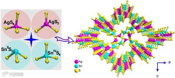 锡基金属硫属化物由于在光电、光催化、非线性光学和离子交换等方面具有潜在的应用价值,对其研究一直受到广泛关注。近年来,通过引入第二、甚至第三金属离子(如Ag+、Cu+、Zn2+)来组装锡基的多元金属硫属化物已成为一个重要的研究方向。与此同时,具有混合价态的化合物由于在超导、金属传导、电荷密度波和磁性等方面的广泛应用,已逐渐成为新材料家族里面非常重要的组成部分。然而,具有混合价态的硫代锡(II、IV)酸盐却少有报道,为数不多的例子主要集中于一些纯无机的化合物。
