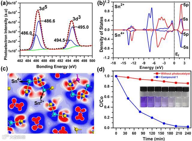 该化合物的迷人之处在于其存在两种价态的锡离子,即SnII和SnIV。X-射线光电子能谱(XPS)不仅证实了其含有混合价态的锡离子,还从实验上证实了这两种价态的比例约为1/2.1,这与单晶衍射分析的结果相一致。理论计算进一步证实了这一结论。有趣的是,该化合物在可见光的照射下,具有良好的光催化降解有机染料紫晶(CV)的能力;经200分钟的可见光照射,可达到92%的降解。这项工作证实应用溶剂热法可以获得混合价硫代锡酸盐,对今后获得更多的有机导向的混合价多元金属硫属化物具有启示作用。此前,他们刚以通讯形式报道了一例结构新颖的具有近红外光敏性能的多元硫属化物(NH4)4Ag12Sn7Se22(Inorg. Chem., 2016, 55, 5110-5112)。