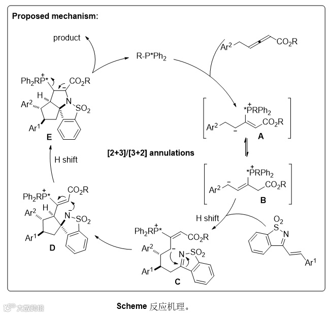 最后,作者根据以前的工作以及本文的实验结果,提出了该连续环化反应的机理(Scheme)。手性膦首先对联烯进行加成,生成中间体A,以及共振式B,B对活性亚胺进行1,4加成,接着进行一次质子迁移生成中间体C,接着中间体C发生对亚胺的分子内加成,生成第一个环状中间体D,然后,氨基负离子发生一次分子内极性反转加成,生成第二个环状中间体E,再次发生一次质子迁移脱去催化剂,生成目标产物。值得注意的是,在整个催化循环过程中,质子转移过程起了很重要的作用,双官能团手性膦催化剂上催化活性中心膦以及N-H键的氢键共同作用对于产物手性的控制具有重要作用。