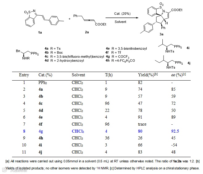 作者在条件实验中(Table 1),对不同结构的手性双官能团有机膦催化剂的筛选发现:催化剂氨基上的N-H酸性对于反应的活性和选择性有很大的影响。催化剂4g表现出最好的催化效果,能够以80%的产率和92.5%的对映选择性得到产物3。综合考虑反应活性、对映选择性等因素及其它的反应参数,包括催化剂的量、溶剂等,最后确定最优反应条件为:20% 4g为催化剂,氯仿为反应溶剂,浓度为0.10 mol/L,室温下反应(Table 1)。