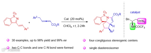 最近,该课题组用设计发展新的多官能团有机膦催化剂,成功实现了一系列多官能化稠杂环化合物的不对称构建。反应中作者采用廉价易得的糖精衍生的烯基亚胺和-苄基取代的联烯酸酯作为起始原料,在温和的条件下,使用N-三氟乙酰胺基膦作为催化剂,能够高产率、高选择性、高原子经济性地快速构建含有四个环的稠杂环化合物,该类化合物具有四个连续手性中心(一个季碳中心和三个叔碳中心),并且所有反应都只得到一个非对映异构体。