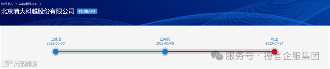 2023年7月24日,上交所公告,因北京清大科越股份有限公司(以下简称“清大科越”)撤回发行上市申请,根据相关规定,终止其首次公开发行股票并在科创板上市审核。