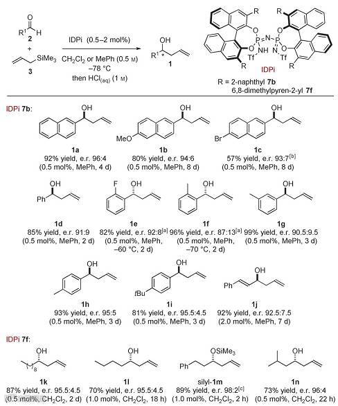 作者首先成功设计合成了一系列新颖的手性Brønsted催化剂(Scheme 1)。作者发现对芳香醛底物,催化剂7b取得最好的催化结果。催化剂用量低至0.5%。该催化体系对芳香醛的取代基具有良好的包容性,不管是供电子基团,还是拉电子基团,都能以中等到良好的产率(57-92%)和良好到优秀的对映选择性(74-92%)得到目标产物,但是反应需要较长的反应时间(2-8天)。对于脂肪醛而言,催化剂7f能得到最好的催化结果,溶剂也由甲苯变为二氯甲烷,能以70-89%的产率和91-96%的对映选择性得到目标产物,由于脂肪醛的高活性,反应时间也大大缩短(从2小时到2天不等)(Scheme 2)。