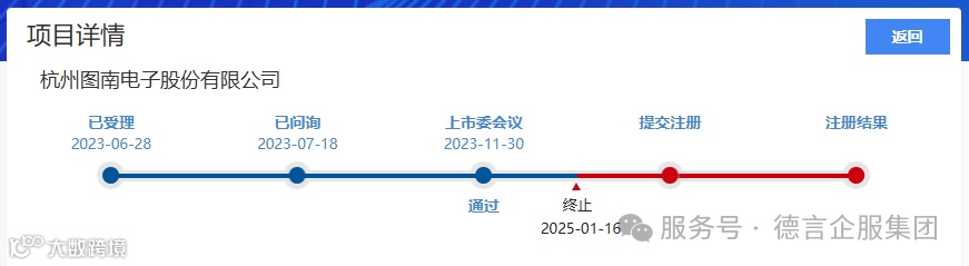 2025年1月17日,北交所公告,因杭州图南电子股份有限公司(以下简称“图南电子”)撤回发行上市申请,根据相关规定,终止其首次公开发行股票并在北交所上市审核。