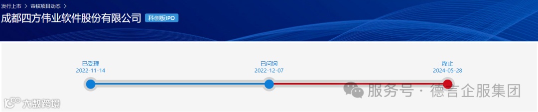 2024年5月28日,上交所公告,因成都四方伟业软件股份有限公司(以下简称“四方伟业”)撤回发行上市申请,根据相关规定,终止其首次公开发行股票并在科创板上市审核。