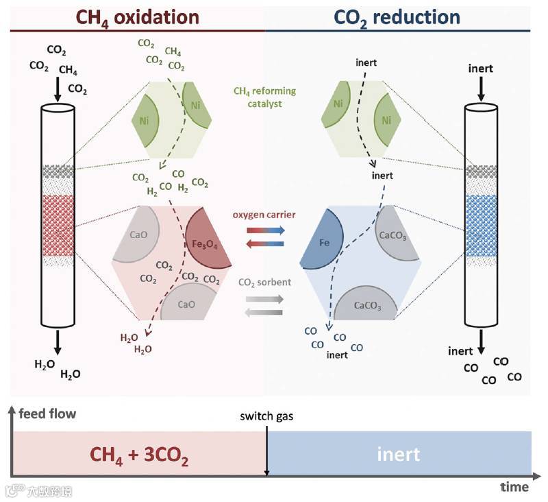 看到这一过程里有这么多化学反应的“平衡”,大家脑海里有没有浮现出“勒夏特列原理”[1]这几个大字?不管你有没有想到,比利时根特大学的Vladimir V. Galvita和Guy B. Marin等人想到了,他们用这个有百多年历史的“老”原理,解决了甲烷二氧化碳重整制合成气中的大问题,并顺手发了一篇Science。该团队使用Ni催化剂、CaO/Al2O3和Fe3O4/MgAl2O4三种催化剂,利用氧化还原反应的过程将含氢物种(水)与含碳物种分离,拉动了平衡,提高了二氧化碳的转化率,并得到了富一氧化碳的产物。这条碳利用率较高的新工艺,作者称其为“甲烷超干重整(super-dry reforming of methane)”。(Super-dry reforming of methane intensifies CO2 utilization via Le Chatelier’s principle. Science, 2016, DOI: 10.1126/science.aah7161)。