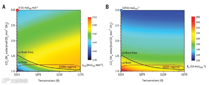 相比于传统的DRM工艺(下图棕色椭圆区域),“超干”重整在1023K的较低温度下下能得到较高的CO收率,并防止了积碳的产生(图六 A),而转化单位CO2所需的能量也较低(图六 B)。