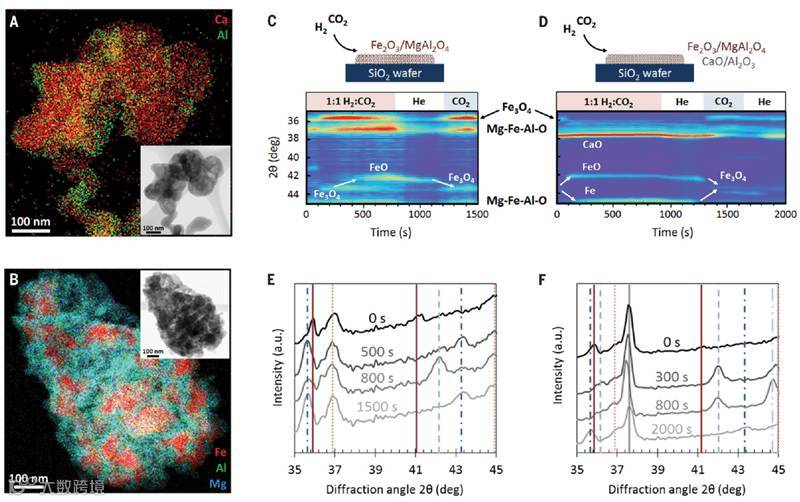 这个体系中将CaO/Al2O3与 Fe3O4/MgAl2O4催化剂混合是实现完整的氧化还原过程的关键。如图五所示,作者采用了时间分辨XRD谱观察了反应气氛和吹扫气氛下Fe物种的变化,可以观察到只有当CaO/Al2O3存在时(图五D和F),Fe3O4才能够被完全还原成Fe和FeO。