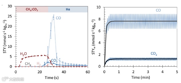 通过热力学数据,这一过程每转化1 mol二氧化碳分子需要110 kJ能量,比常规DRM(图一1)所需的247 kJ要低。同时,这一过程大大提高了二氧化碳的转化率。如图四所示,在切换到氦气吹扫后检测产物,二氧化碳转化率要高于常规的DRM过程,而提纯得到的一氧化碳收率也要高于传统工艺,并且指标收率还有进一步上升的空间。