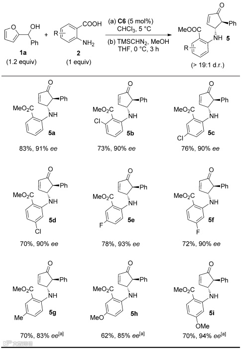 在最佳反应条件下,作者考察了一系列邻氨基苯甲酸衍生物。从结果可以看出,该催化体系对芳环上的取代基类型具有良好的包容性,能以良好的产率(62-83%)和优秀的对映选择性(83-94%)得到目标产物(Table 1)。