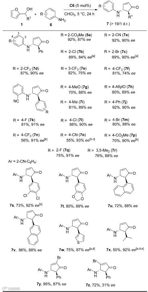 为了进一步研究该不对称重排反应的底物普适性,作者还考察了各种取代芳胺和2-呋喃苯甲醇衍生物。从结果可以看出,作者拓展了众多底物,除了个别产率和对映选择性稍低外,其它产物的产率和对映选择性都在80%以上,产率最高可以达到92%,对映选择性最高可以达到93%(Table 2)。