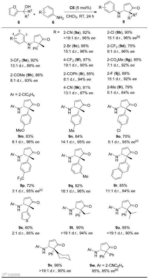 随后作者重点考察了2-呋喃三级苯甲醇的aza-Piancatelli反应,得到的目标产物含有连续两个手性中心,并且其中一个是一般方法难以构建的季碳手性中心。从结果可以看出,底物普适性很好。产率最高可达92%,非对映选择性最高可达19/1,对映选择性最高可达96%。然而,对于芳胺取代基,当邻位连有供电子取代基(如甲基)时,产物9l对映选择性只有64%。对于杂环取代基团,如噻吩环取代的2-呋喃三级甲醇作为底物时,虽然目标产物9s能以95%的对映选择性被得到,但目标产物的非对映选择性只有2/1(Table 3)。
