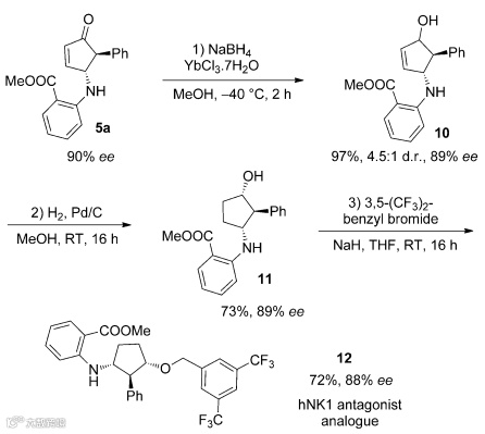为了证明该催化体系的实用性,作者还进行了HNK1抑制剂类似物的合成研究。使用aza-Piancatelli产物5a作为起始原料,先Luche还原酮羰基,接着氢化还原双键,最后和3,5-二三氟甲基溴苄发生亲核取代反应,只需要三步反应就可高效进行HNK1抑制剂类似物的合成。最终化合物的对映选择性也没有出现明显降低的现象(Scheme 3)。