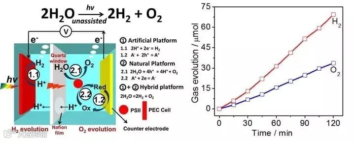 该系统不仅可以实现太阳能驱动下完全分解水反应(即:2H2O→O2+2H2),而且H2和O2自然分离,避免了传统Z-scheme设计中H2/O2难以分离的问题;叠层设计实现了人工系统对短波段、自然系统对长波段太阳能的互补吸收,大大提高了太阳能利用效率和系统稳定性。该研究为进一步发展高效自然-人工杂化太阳能光合体系提供了新的思路。