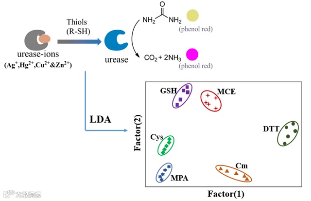 图1:基于脲酶-金属离子传感阵列用于硫醇区分的原理图
