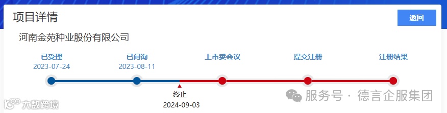 2024年9月6日,北交所公告,因河南金苑种业股份有限公司(以下简称“金苑种业”)撤回发行上市申请,根据相关规定,终止其首次公开发行股票并在北交所上市审核。