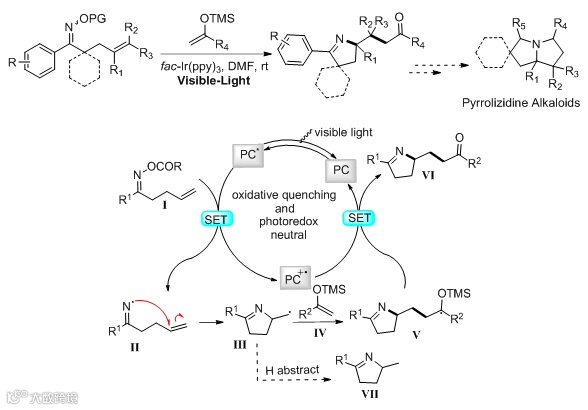 近日,中国科学技术大学罗德平教授课题组与南京工业大学冯超教授课题组合作,首次报道了一步反应选择性生成C-N/C-C键用以合成多官能化二氢吡咯衍生物的方法。该方法基于可见光促进产生亚胺自由基,然后依次经过分子内环化和分子间自由基加成分别形成C-N键和C-C键,最终得到二氢吡咯。该反应操作简便、反应条件温和;底物适用性广,对含有不同取代基和官能团的底物均能取得理想的产率。值得一提的是,该反应可以很容易地放大到克级规模,具有很强的实用性。应用此方法可以通过简单的一步反应得到多官能化的二氢吡咯核心骨架,为一些具有该类结构的生物碱或者天然产物的合成提供了新的方法和思路。