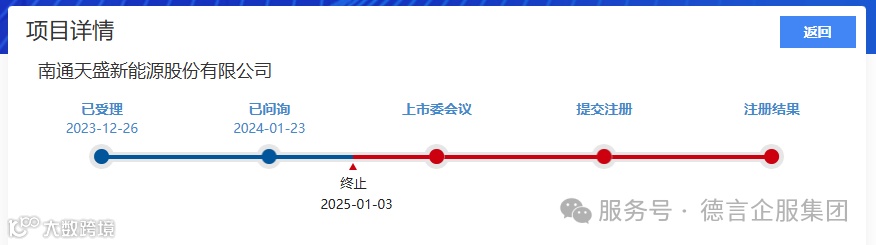 2025年1月10日,北交所公告,因南通天盛新能源股份有限公司(以下简称“天盛股份”)撤回发行上市申请,根据相关规定,终止其首次公开发行股票并在北交所上市审核。