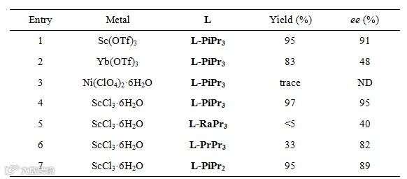 为了验证猜想,作者选择环丙基酮1a和邻苯二胺2a作为标准底物来进行反应。当加入Sc(OTf)3/L-PiPr3配合物时,开环/环化/逆曼尼希反应确实发生了,以95%的收率和91% ee的对映选择性得到目标产物3aa。同时并未检测到二氢吡咯产物的生成。通过对反应条件进一步优化,最终得到的最佳反应条件是:ScCl36H2O 作为中心金属,L-PiPr3作为配体,1,1,2,2-四氯乙烷作为溶剂,在35 ℃条件下反应48小时(Table 1, entry 4)。