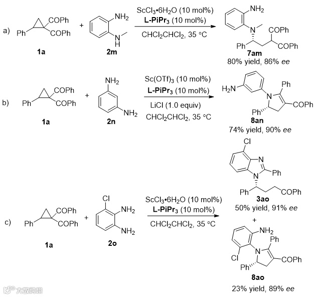 在最佳条件下,作者对底物普适性进行了考察。首先固定邻苯二胺2a,考察环丙基酮上取代基对反应的影响。从催化结果可以看出,间位和对位上的取代基不管是吸电基还是供电基对产物的活性和对映选择性影响都较小。但是邻位甲基取代的底物只给出80% ee。此外,稠环和脂肪取代的底物也能给出较好的结果(3ka-3na)。值得一提的是,当利用螺环类型环丙烷1q参与反应时,以中等的对映选择性得到八元环的手性苯并咪唑衍生物(Table 2)。