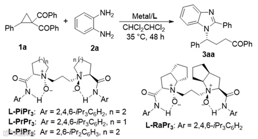 苯并咪唑,尤其是含有手性链的衍生物广泛存在于天然产物和具有生物活性分子中。因此合成该类化合物引起了许多化学家的关注,合成该类化合物报道主要集中在利用手性原料来构建苯并咪唑骨架。对于不对称的转化,目前仅有两三例利用潜手性的苯并咪唑类底物直接进行官能化反应的报道。这两种策略都需要提前制备手性原料或潜手性的苯并咪唑底物。近期,四川大学的冯小明教授、刘小华教授及其合作者成功地实现了第一例不对称催化环丙基酮与芳基-1,2-二胺的开环/环化/逆曼尼希反应,高效构建了含有手性侧链的苯并咪唑衍生物。该方法一步完成了苯并咪唑骨架的构建并同时实现了其侧链上手性的控制。