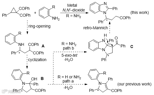 该方法的思路来源于作者之前对环丙基酮与苯胺反应生成2,3-二氢吡咯衍生物的研究。在该研究中,作者认为反应经历了如下历程:首先是苯胺对环丙烷的开环得到中间体A,之后进行分子内的亲核环化形成氨基半缩酮B,最后脱水形成2,3-二氢吡咯(Scheme 1, path a)。在此基础上,作者设想,是否可以通过利用另一分子的亲核试剂胺来捕获中间体B,然后经过5-exo-tet环化脱水过程得到三环中间体C,C再进行一步逆曼尼希反应得到苯并咪唑衍生物(Scheme 1, path b)。