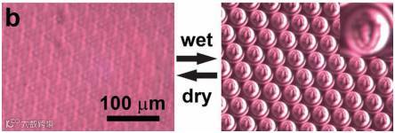 通过表层膜或基底对溶剂的响应性,能够实现皱纹体系表面皱纹形貌的动态调控。如马萨诸塞大学Crosby课题组通过将聚二甲基硅氧烷(PDMS)表面进行UVO处理,使其表面生成SiOx硬层,制备了溶剂响应性的PDMS/SiOx皱纹体系(Adv. Mater., 2011, 23, 4188-4192)。当在PDMS/SiOx体系表面滴加乙醇时,在渗透压作用下,表面生成皱纹形貌;当乙醇挥发完后,表面皱纹形貌也随之消失。