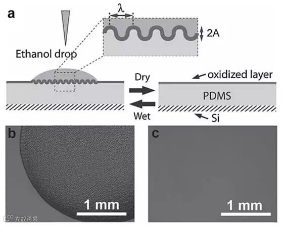 溶剂响应性PDMS/SiOx皱纹体系。图片来源:Adv. Mater.