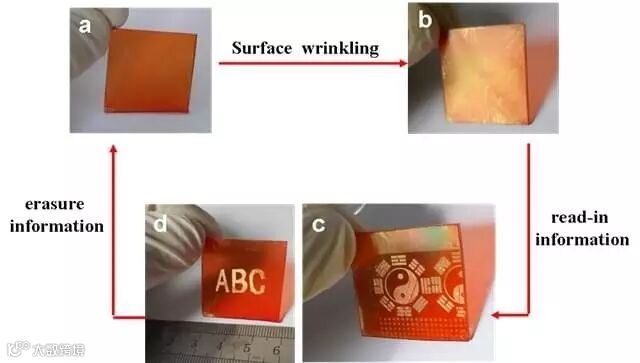 智能皱纹体系在光可擦写信息存储方面的应用。图片来源:Angew. Chem. Int. Ed.