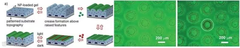 光,作为一种外界刺激,具有清洁无污染,且能够远程、快速、精确控制的优点。因此,光响应性材料成为制备智能驱动器、药物缓释等领域的热门材料。将光响应性聚合物引入微纳图案化体系,能够实现其表面图案的光控动态调控或选区图案化。马萨诸塞大学Hayward课题组在温敏性的聚异丙基丙烯酰胺(PNIPAM)褶皱(crease)图案中引入氧化铁纳米颗粒(iron oxide nanoparticles, NPs),通过NPs的光热效应,实现了温敏性褶皱图案的动态可控(Angew. Chem., 2012, 124, 7258-7261)。