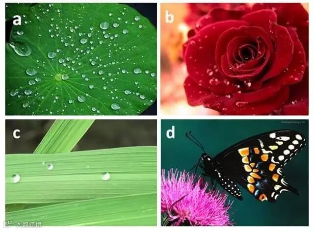 自然界中的微纳结构表面。a.荷叶,b. 玫瑰花,c. 稻叶,d. 蝴蝶。图片来自网络