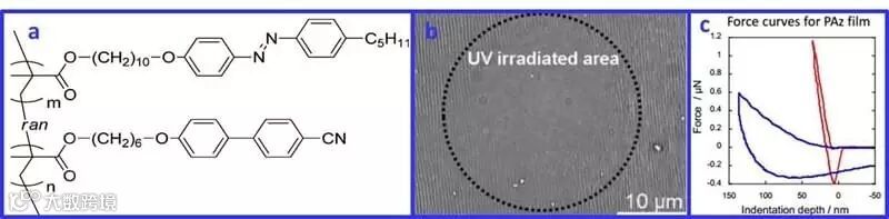 在皱纹体系膜材料中引入含偶氮苯(azo)等光响应性基团,也是构筑光响应性微纳图案的常用方法。名古屋大学Takahiro Seki课题组研究发现,以PDMS为基底、以含偶氮苯液晶材料(下图a)为硬层构筑软硬复合体系,其表面拉伸回缩产生的皱纹形貌能够通过紫外光照射进行振幅调控或擦除(下图b)。他们将这一现象归因于含偶氮苯膜受到指定波长的光照射时,其膜内产生光软化效应,导致其模量降低(通过光照前后的AFM力曲线测试进行表征,下图c),从而使得体系起皱的临界压缩应力增大,导致表面皱纹的消失(Macromolecules, 2015, 48, 6378-6384)。