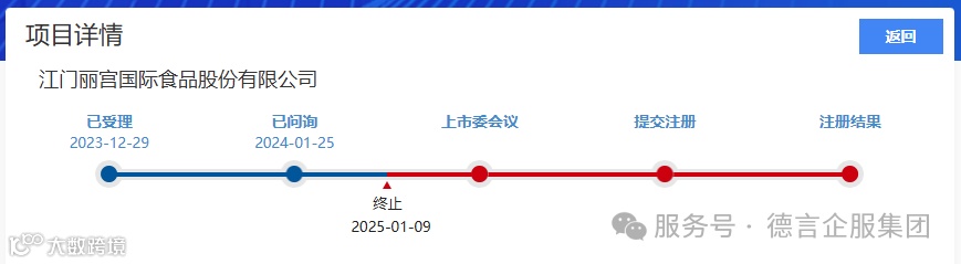 2025年1月24日,北交所公告,因江门丽宫国际食品股份有限公司(以下简称“丽宫股份”)撤回发行上市申请,根据相关规定,终止其首次公开发行股票并在北交所上市审核。
