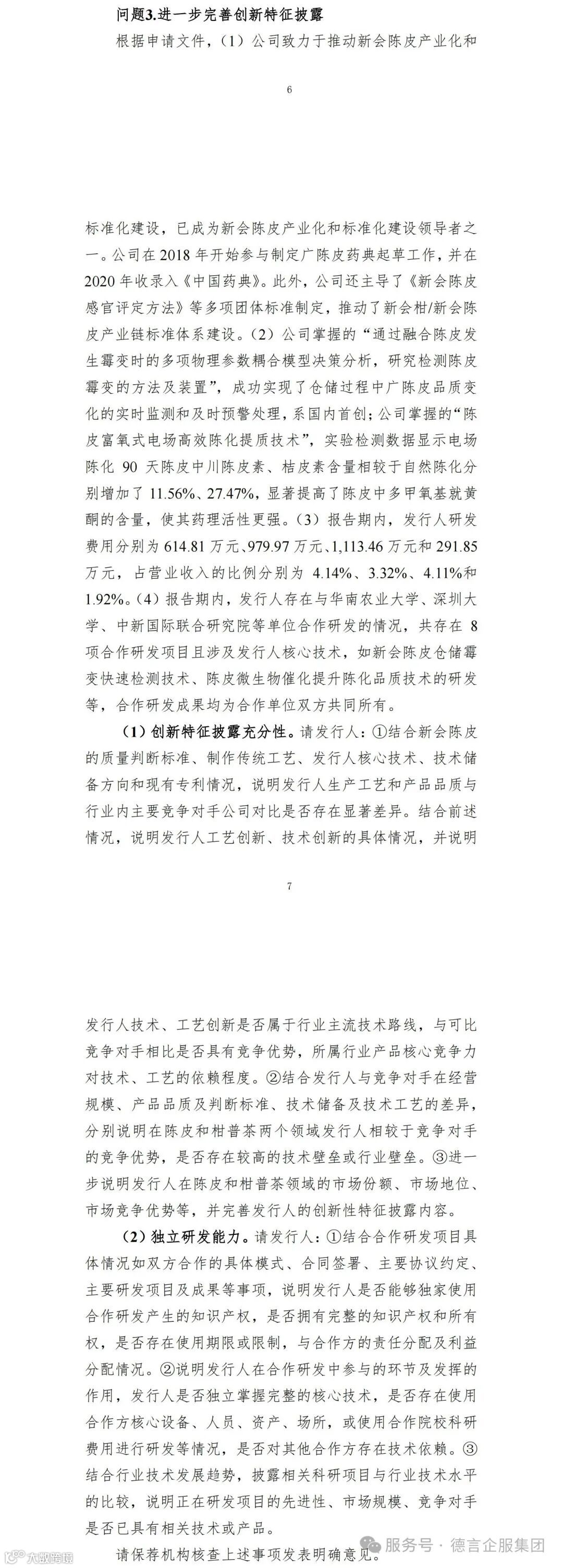 ③进一步说明发行人在陈皮和柑普茶领域的市场份额、市场地位、市场竞争优势等,并完善发行人的创新性特征披露内容。