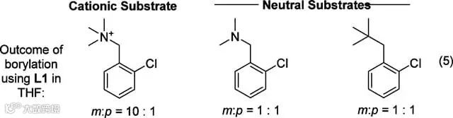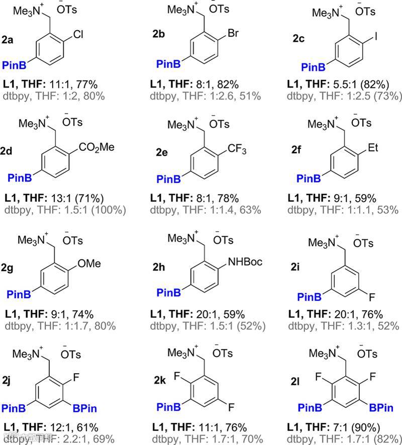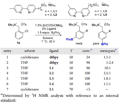 经典的Ir催化芳环C-H键硼化反应主要得到的是位阻控制的产物,即间位和对位的混合产物,常常难以分离(Fig. 1-3)。为了应用离子对相互作用来改善这一反应的选择性,研究团队选择了在底物上连接一个易于得到的阳离子——季铵离子,而在配体上则加上了一个带负电荷的磺酸根离子(Chart 1-4),经过筛选,在使用L1作为配体时,以苄基季铵盐作为底物的模板反应能以96%的转化率得到间对比10:1的产物(Scheme 1),而且L1这个配体只需要两步就可以从便宜的原料合成。