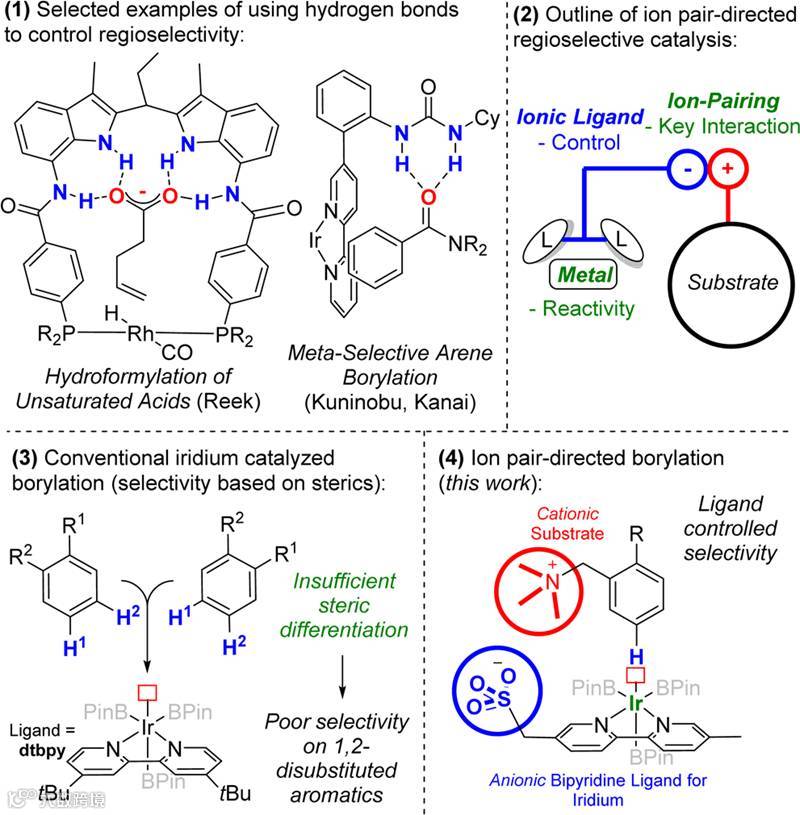 非共价相互作用导向的过渡金属催化是一种很有发展潜力的具备区域选择性的合成策略。研究者在近年来发展了一些基于氢键相互作用的区域选择性控制方法,但是离子对相互作用尚未应用于这一领域(Fig. 1-1)。相比较而言,离子对相互作用更强,对底物和配体的要求会比较低,具有更广泛的应用前景。剑桥大学化学系的Robert J. Phipps研究团队基于离子对相互作用,通过底物上的季铵离子和配体上的磺酸根离子相互作用,使用Ir催化芳环间位选择性C-H键硼化反应,成功得到了间位选择性的产物(间位/对位 = 10:1),底物适用性也非常好,该工作发表在JACS上。(Ion Pair-Directed Regiocontrol in Transition-Metal Catalysis: A Meta-Selective C−H Borylation of Aromatic Quaternary Ammonium Salts. J. Am. Chem. Soc., 2016, 138, 12759-12762, DOI: 10.1021/jacs.6b08164)。