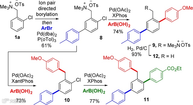 研究者在最后将这一反应得到的产物进一步进行了转化,其中,C-B键和季铵盐官能团都可以通过Suzuki反应进行芳基化,而季铵盐结构还可以通过钯碳加氢反应去除转化烷基(Scheme 4)。通过以上的转化反应,研究者可以选择性地得到多芳基取代的产物,展现了这个反应巨大的应用潜力。