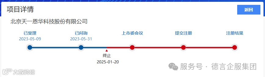 据德言企服了解,天一恩华北交所IPO于2023年5月9日被受理,期间共收到两轮审核问询函,于2025年1月20日终止审核。