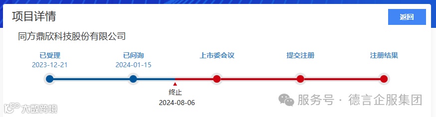 2024年8月9日,北交所公告,因同方鼎欣科技股份有限公司(以下简称“鼎欣科技”)撤回发行上市申请,根据相关规定,终止其首次公开发行股票并在北交所上市审核。