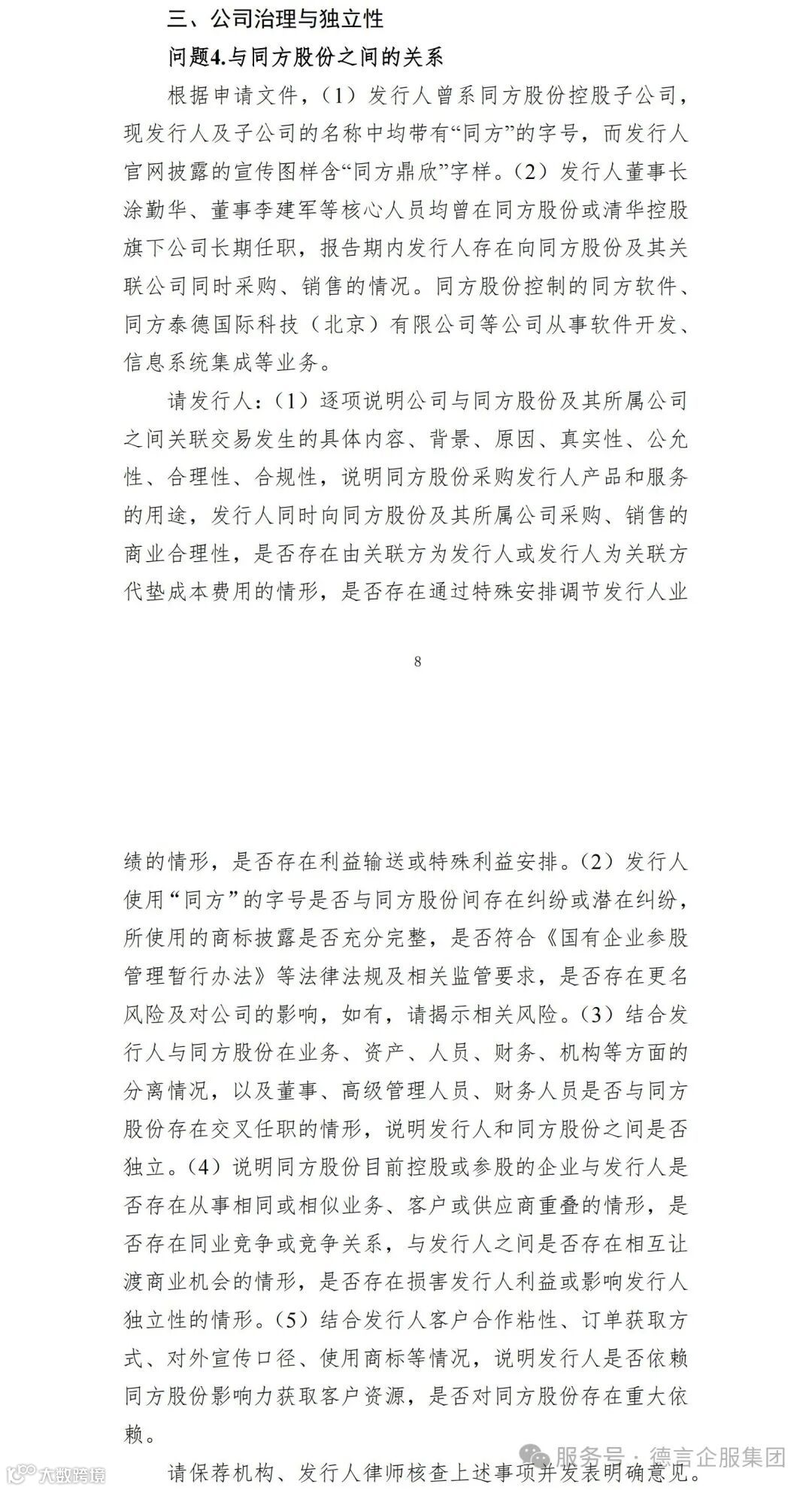 (3)结合发行人与同方股份在业务、资产、人员、财务、机构等方面的分离情况,以及董事、高级管理人员、财务人员是否与同方 股份存在交叉任职的情形,说明发行人和同方股份之间是否独立。