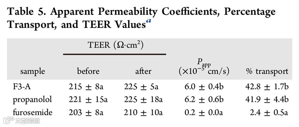 鉴于F3-A是个有生物活性的分子,作者又研究了这个分子的细胞渗透性。细胞渗透性研究模型是经典的Caco-2细胞。作者另选了高渗透性高溶解性药物普萘洛尔和高溶解性低渗透性药物呋塞米作为对照。实验结果表明,F3-A具有较高的渗透性。加之F3-A具有良好的水溶性,作者据此推测,F3-A可能会像普萘洛尔一样具有较高的生物利用度而发挥其抗炎活性。