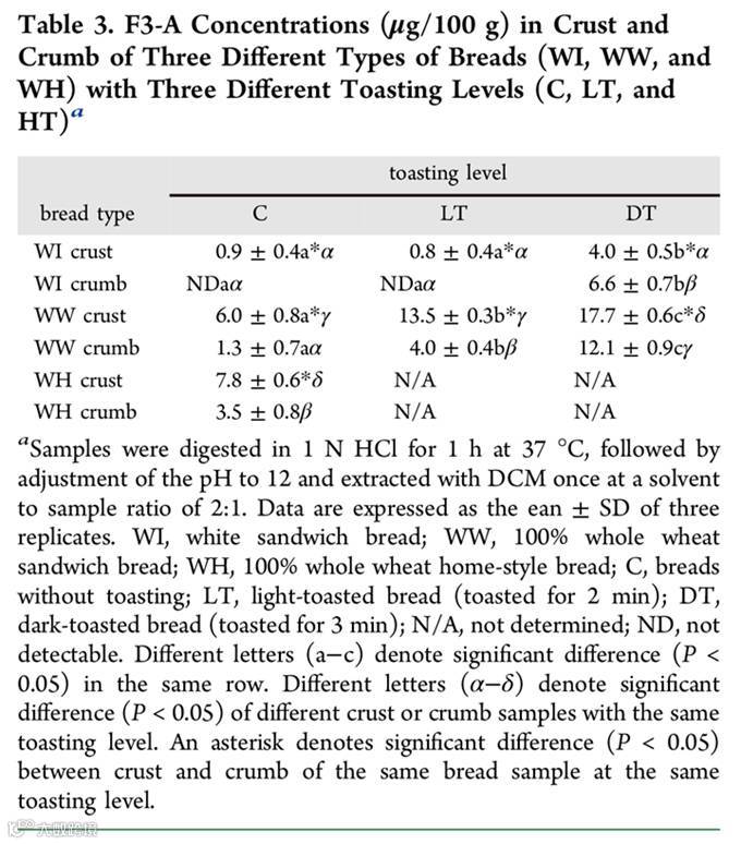 咱们关注的重点肯定是面包了!作者研究了三种面包(WI, white sandwich bread、WW, 100% whole wheat sandwich bread、WH, 100% whole wheat home-style bread,我平时面包吃的少,还真不知道该怎么翻译)的面包皮和面包屑在暗烤、光烤和不烤情况下F3-A的含量。具体结果大家看这个表格一目了然。当然,作者也对这个结果进行了分析,能看懂上面反应机理的同学基本都能分析出个所以然来。