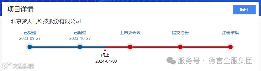 2024年4月9日,北交所公告,因北京梦天门科技股份有限公司(以下简称“梦天门”)撤回发行上市申请,根据相关规定,终止其首次公开发行股票并在北交所上市审核。