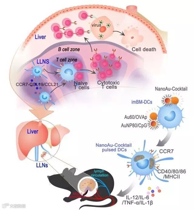 基于活体小动物分子影像平台,研究团队对过继性DCs体内成像示踪发现,该纳米促进剂可使DCs总淋巴器官归巢数量提高15倍,肝脏引流淋巴结归巢数量提高36倍,大大提高其所激活的抗原特异性T细胞免疫应答和抗嗜肝病毒感染效率,为优化临床DCs细胞治疗方案提供了新的思路。
