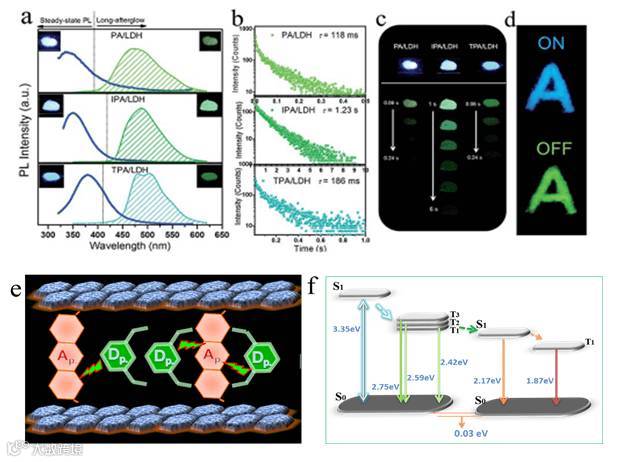 图二. 纳米插层材料长寿命磷光发射(a-d)以及给受体磷光能量转移过程示意图(e,f)