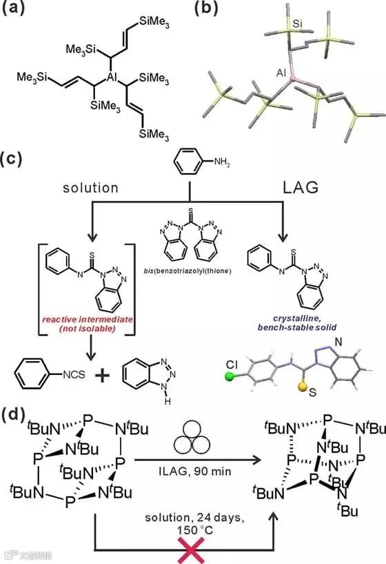 图4. 通过机械化学实现的“不可能”的分子。a.b. 三(烯丙基)铝络合物;c. 芳基N-硫羰基三唑;d. 金刚烷型的P4N6-phosphazane。图片来源:ACS Cent. Sci.