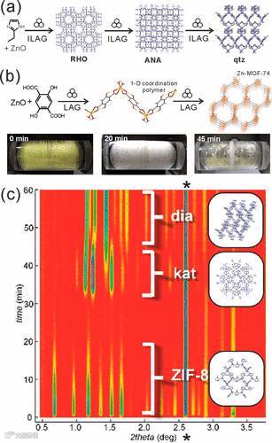 图2. 原位研究MOF分步合成。a. 合成ZIFs;b. Zn-MOF-74;c. 发现ZIF-8中的katsenite相。图片来源:ACS Cent. Sci.