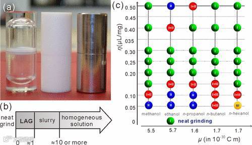 图1. a.不同材质的球磨罐的从左到右为:PMAA、聚四氟乙烯和不锈钢;b.不同反应环境中的η值;c.影响咖啡因与邻氨基苯甲酸共晶晶型I、II、III的η值和液体偶极矩μ。图片来源:ACS Cent. Sci.