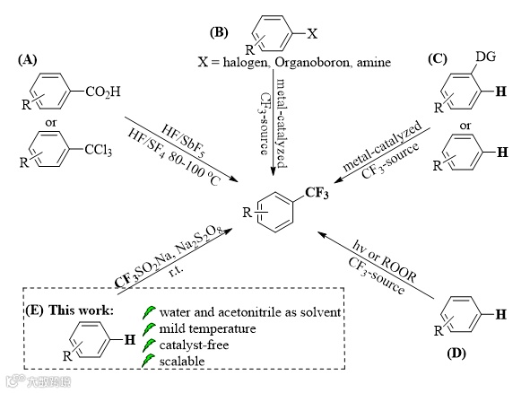 目前已有许多使用不同三氟甲基化试剂实现芳环三氟甲基化的报道,主要包括四类(Scheme 1):(A)最初芳烃的三氟甲基化往往通过羧酸或氯甲基基团与有毒的氟化试剂反应来实现;(B)金属催化的芳香卤化物、芳基硼和苯胺和各种三氟甲基化试剂反应,优点是得到的三氟甲基化芳烃具有良好的选择性,缺陷是一般需要使用化学计量的金属盐,因而限制了实用性;(C)金属催化芳烃直接三氟甲基化,优点是提高了反应效率,降低整体对环境的影响,然而,反应中的金属催化剂往往难以完全去除,这在医药合成中有一定局限性;(D)近年来有研究采用无金属策略直接实现芳烃三氟甲基化,例如,光诱导和TBHP诱导的自由基三氟甲基化反应。近日,湘潭大学龚行副教授课题组报道了一种温和条件下过硫酸钠诱导芳烃自由基三氟甲基化的方法(E)。在该方法中,以便宜的商品化试剂NaSO2CF3为三氟甲基源,稳定的过硫酸钠为引发剂,以水和乙腈为混合溶剂,30 ℃搅拌反应设定的时间,即可高产率的得到目标化合物。